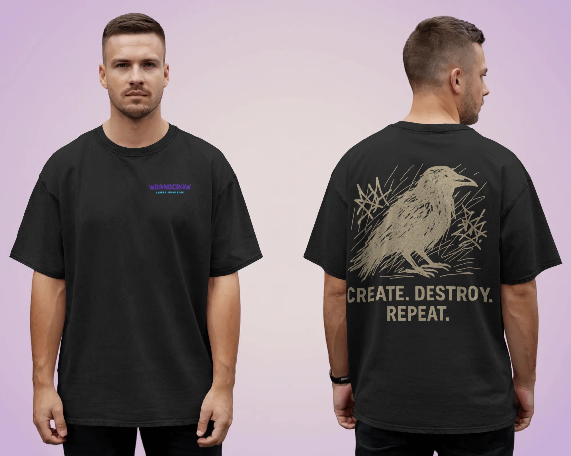 Der rohe, skizzenhafte Crow-Print wirkt wie direkt aus einem Blackbook gerissen. Darunter das Statement „Create. Destroy. Repeat.“ – ein Mantra, das die Dynamik von Street Culture beschreibt: erschaffen, zerstören, neu beginnen.
