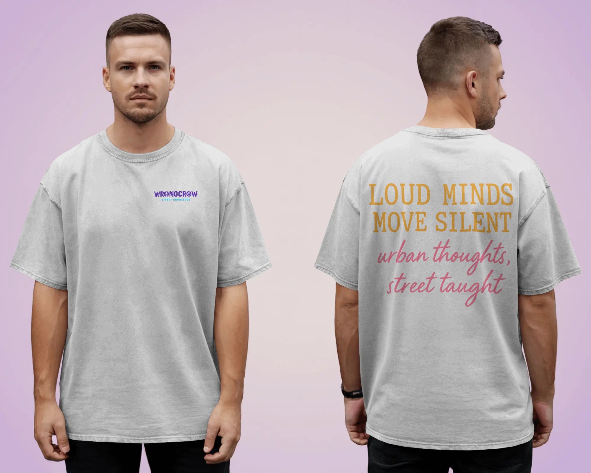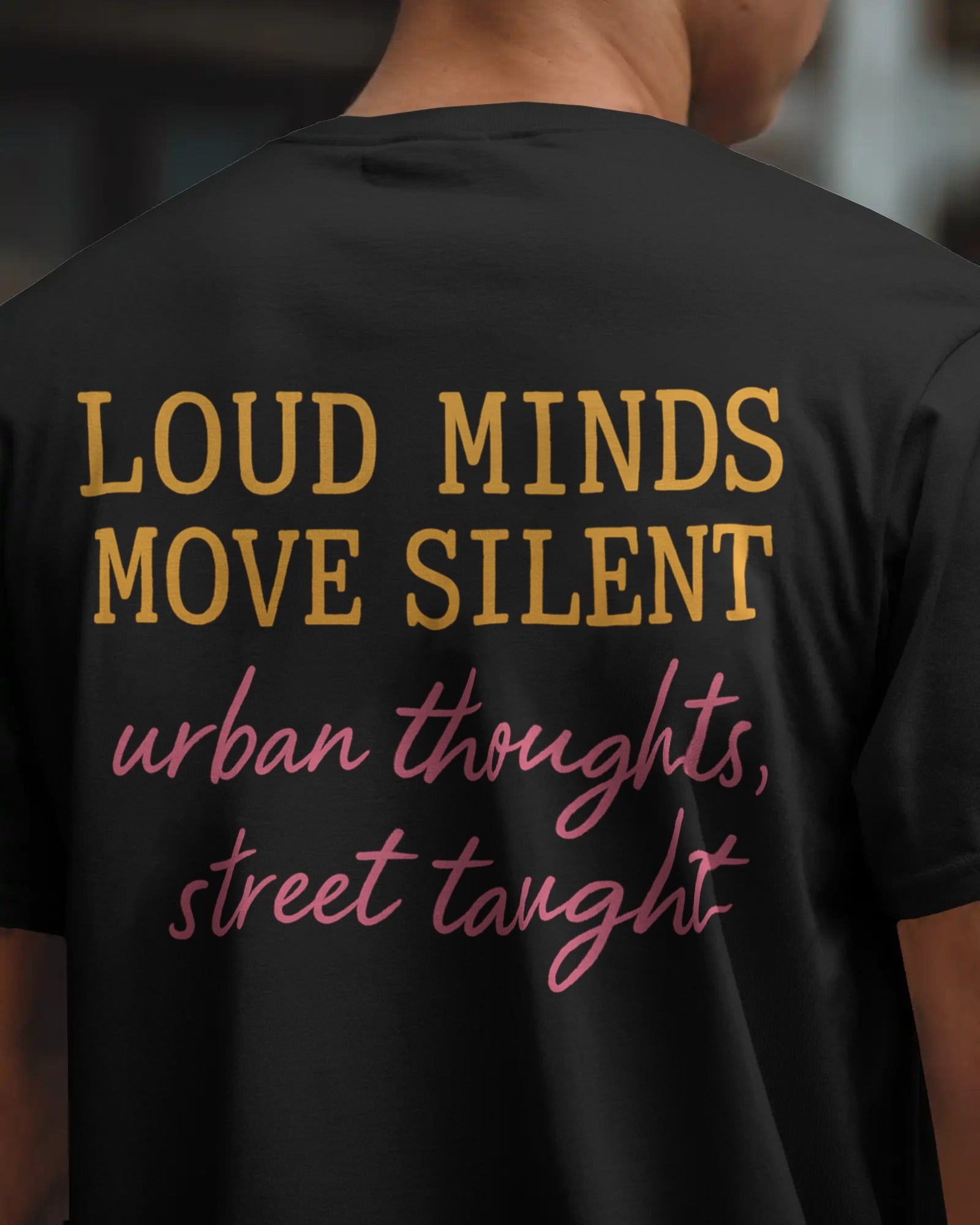 Der Backprint kombiniert klare Typo mit Handschrift: „Loud Minds Move Silent – urban thoughts, street taught.“ Ein Design, das zeigt, dass wahre Stärke nicht laut sein muss.