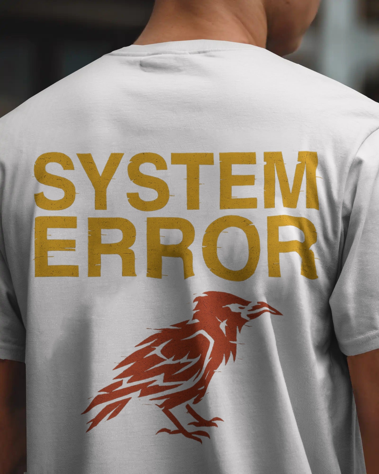 Der Backprint zeigt den Schriftzug „System Error“ in Gelb, kombiniert mit einer roten Krähe – ein Symbol für den Zusammenbruch des Systems.