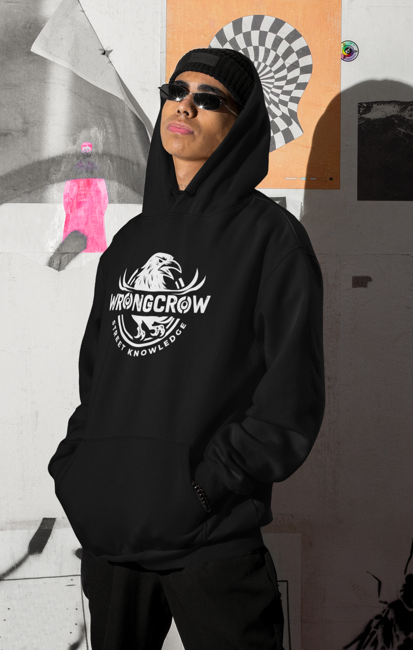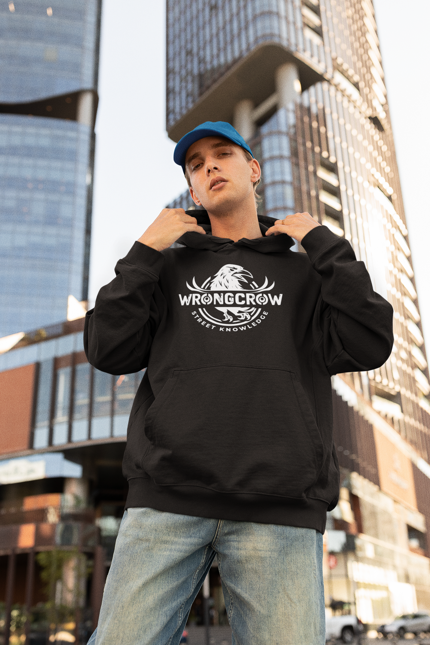 Das Original im Rampenlicht. Mit unserem WRONGCROW Hoodie in schwarz trägst du nicht nur Streetwear, sondern ein Statement. Das große, ikonische Logo auf der Brust, geprägt von "Street Knowledge", macht diesen Hoodie unverkennbar und zu einem Muss für deine Garderobe.