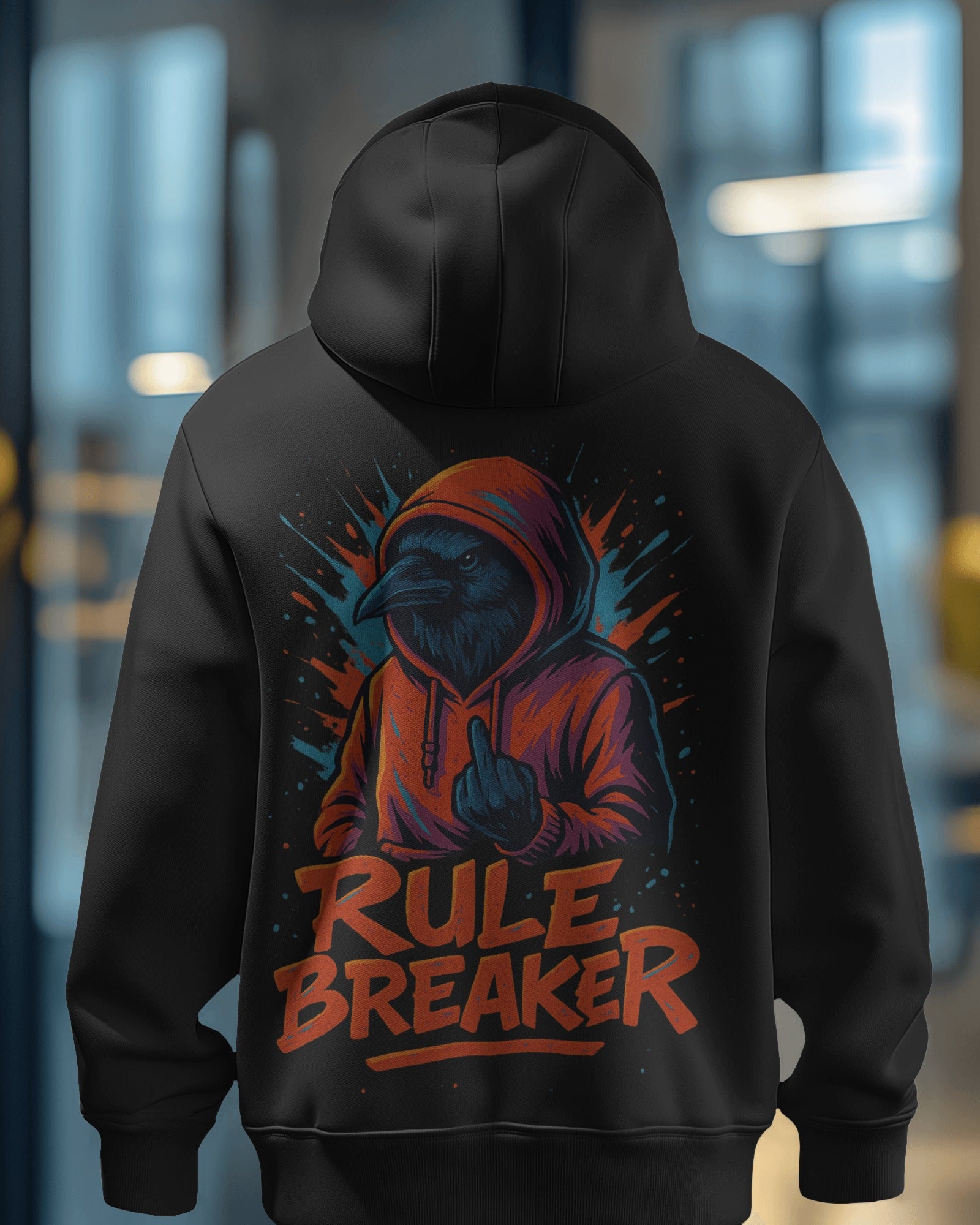 Die Krähe im Hoodie, mit finsterem Blick und erhobenem Mittelfinger, ist ein kompromissloses Symbol für Freiheit. Darunter der markante Schriftzug „Rulebreaker“ – laut, direkt, unübersehbar.