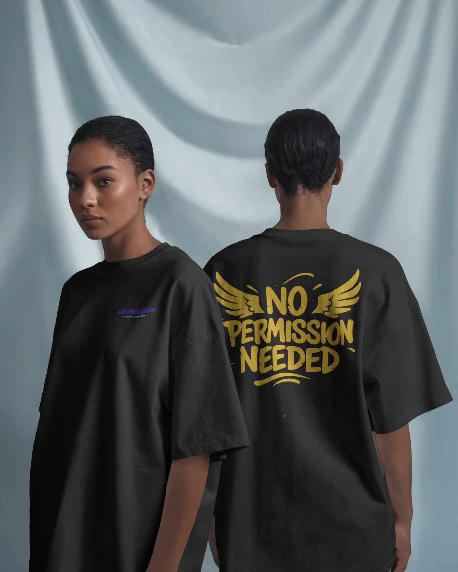 Der markante Backprint „No Permission Needed“ mit auffälligen Wings im goldgelben Graffiti-Stil steht für Freiheit, Unabhängigkeit und den Mut, seinen eigenen Weg zu gehen. Keine Erlaubnis, kein Warten – nur Handeln. Das Design wirkt wie ein rebellischer Tag an der Wand und transportiert puren Street-Spirit.